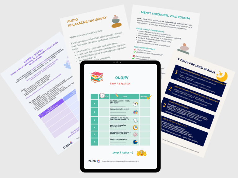 Prestaňte deťom „hustiť“ do hlavy. Začnite im ukazovať cestu. Máte pocit, že ste ako pokazená gramofónová platňa? Ranné vstávanie, umývanie zubov či odchod do postele sa menia na nekonečný boj a opakovanie tých istých pokynov? Deti s ADHD majú problém s exekutívnymi funkciami – informácia, ktorú len počujú, im často „vyletí druhým uchom von“. Tento balíček mení vaše slovné príkazy na vizuálne záchytné body. Pomáha dieťaťu zorientovať sa v čase a povinnostiach, čím znižuje jeho úzkosť a váš stres. Výsledkom je samostatnejšie dieťa a domov bez zbytočného kriku.